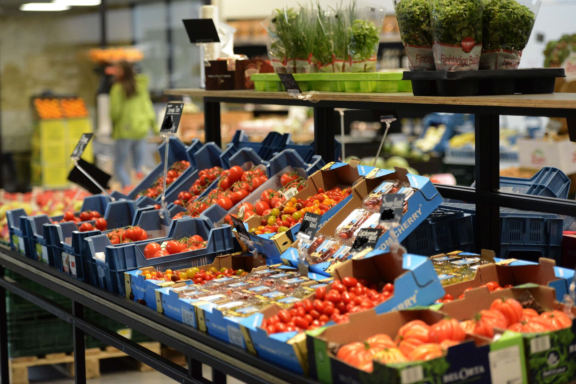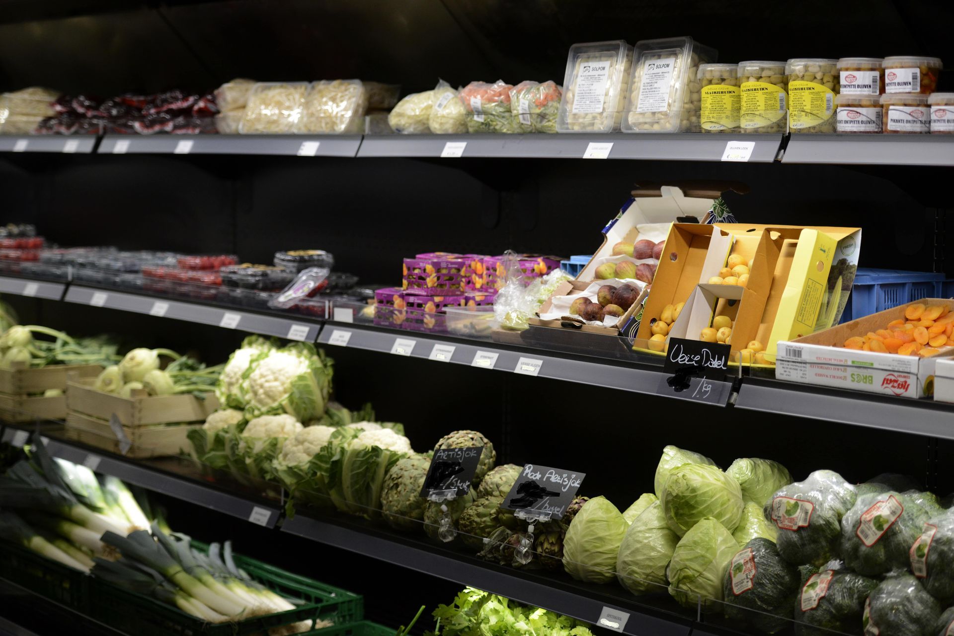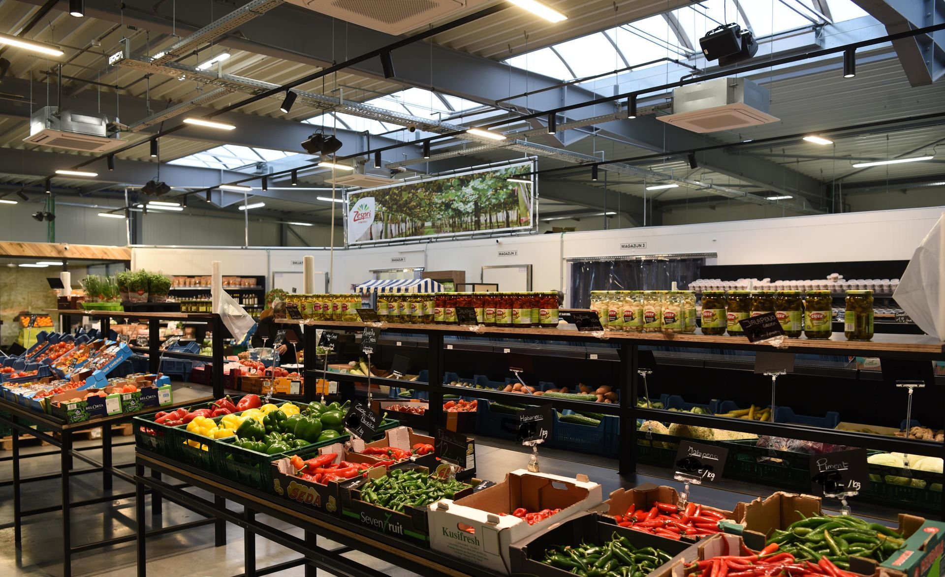 Een zeer uitgebreid assortiment van groenten en fruit, exotische fruit, nootjes,